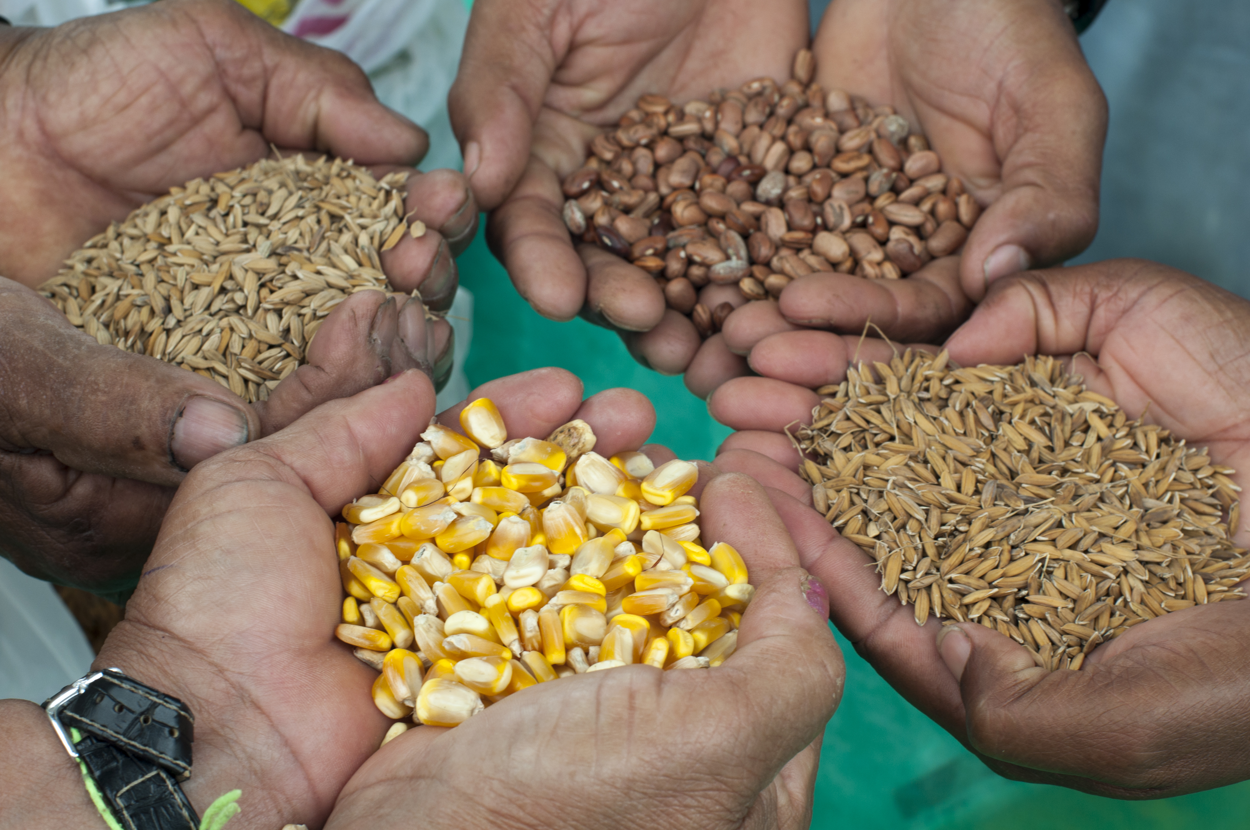 Sementes de milho, feijão e arroz