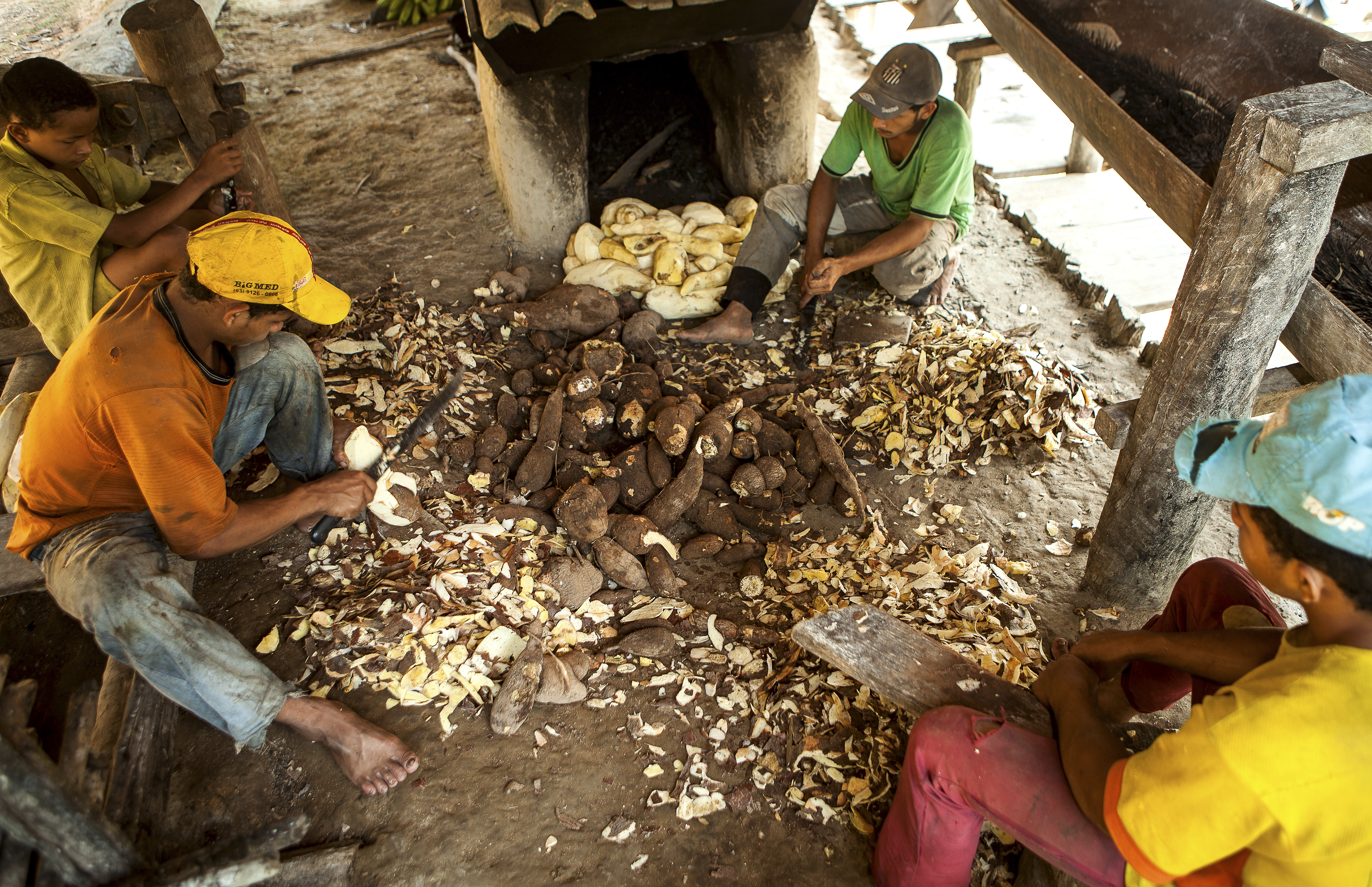 Filhos do Tonhera descascam mandioca para fabricação de farinha