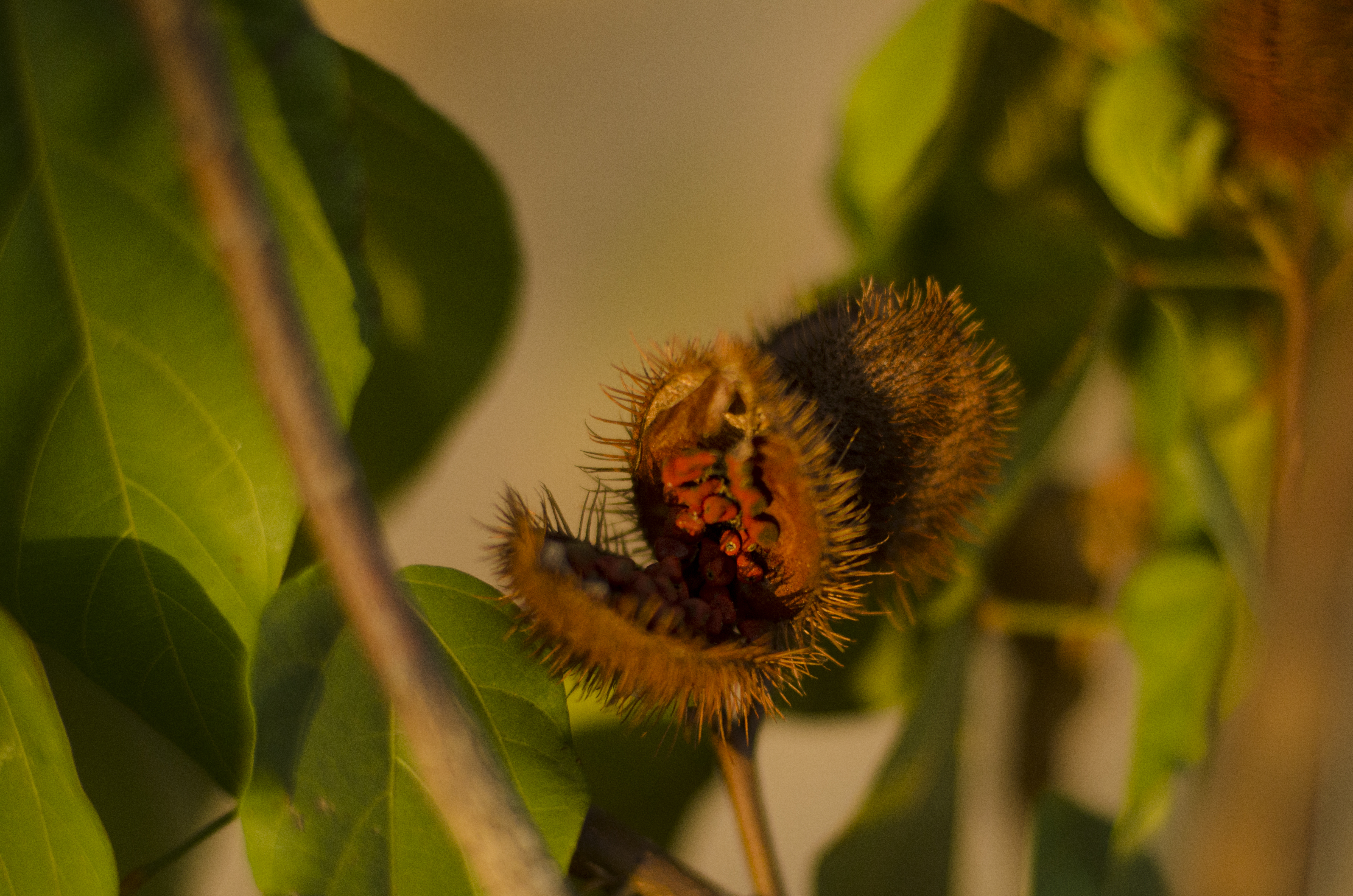 Fruto de urucum (Bixa orellana) aberto na árvore.