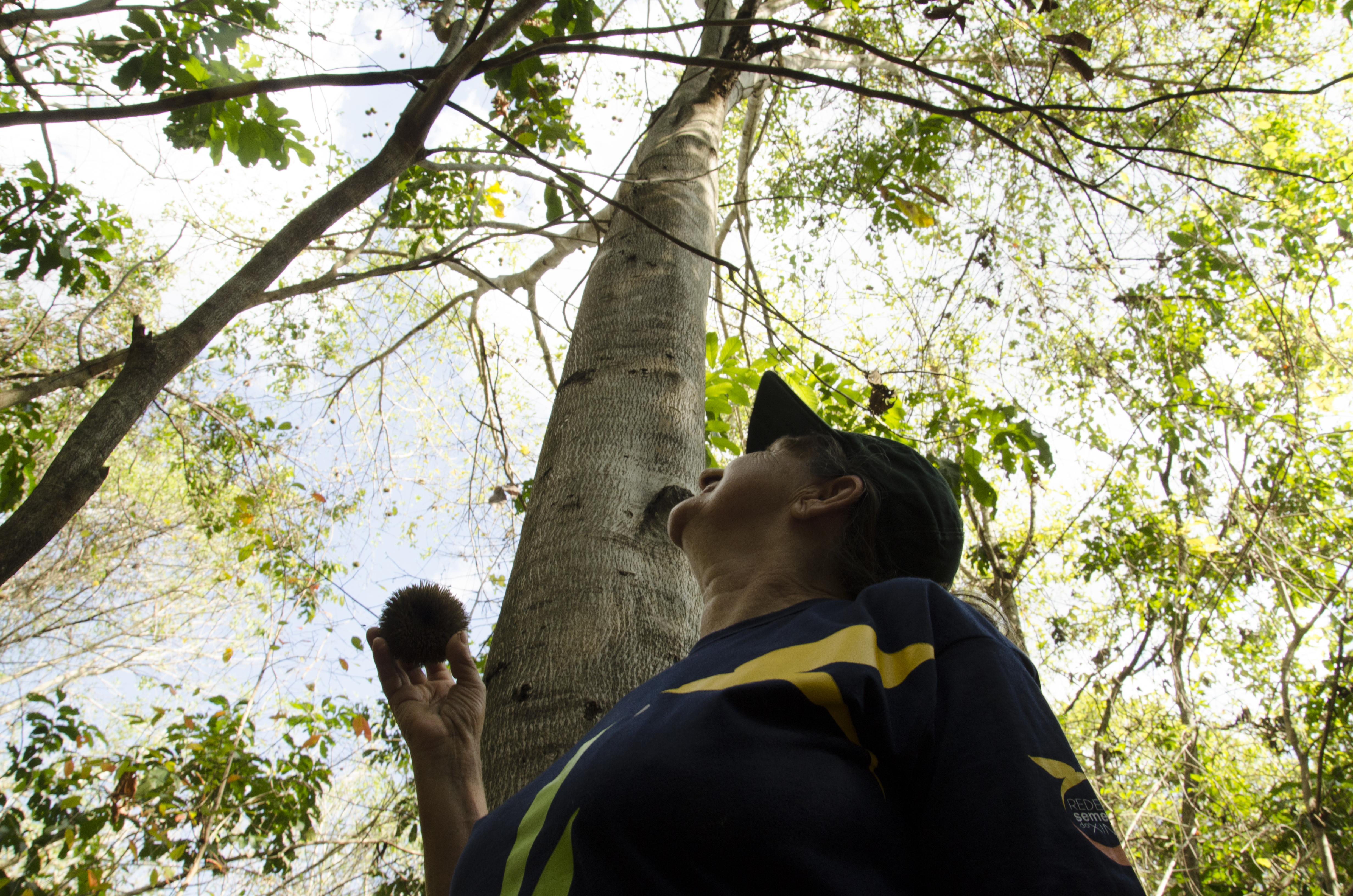 Dona Odete Severino Barbosa em sua propriedade com fruto de Pente-de-Macaco (Pithecoctenium crucigerum) em frente sua matriz.