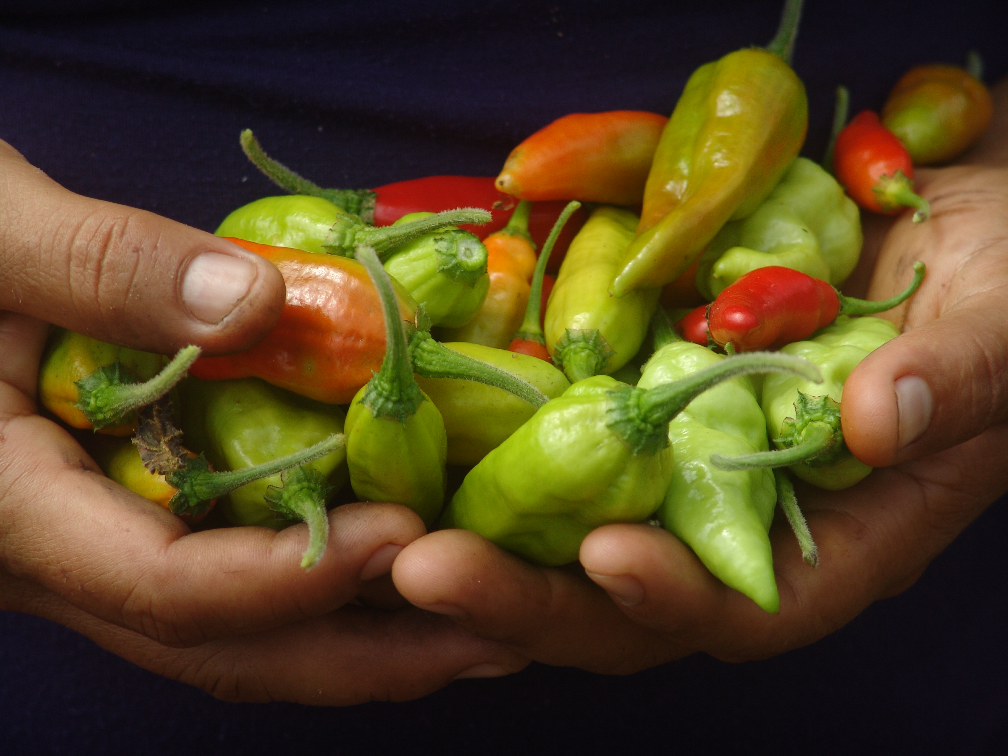 Cláudia, (esposa de André Baniwa, vice-prefeito de São Gabriel da Cachoeira) segurando a pimenta que colheu, Mauá-Cachoeira, Terra IndÃgena Alto Rio Negro, Rio Içana, Amazonas, Brasil.
