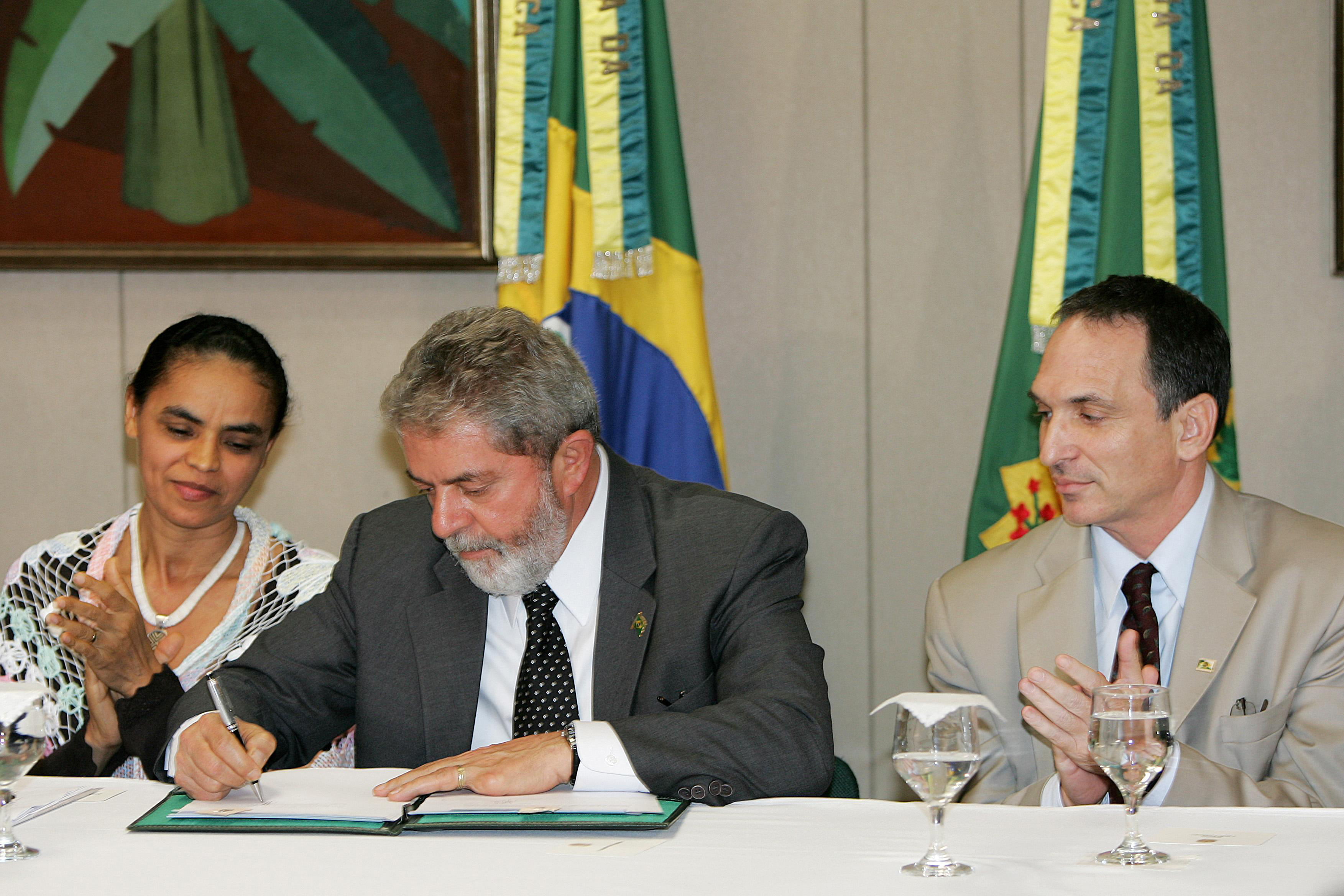 Brasília - O presidente Luiz Inácio Lula da Silva sanciona a Lei da Mata Atlântica, que atribui função social à floresta e estabelece regras para seu uso. Ao lado, a ministra Marina Silva e o ex-deputado Fábio Feldman.