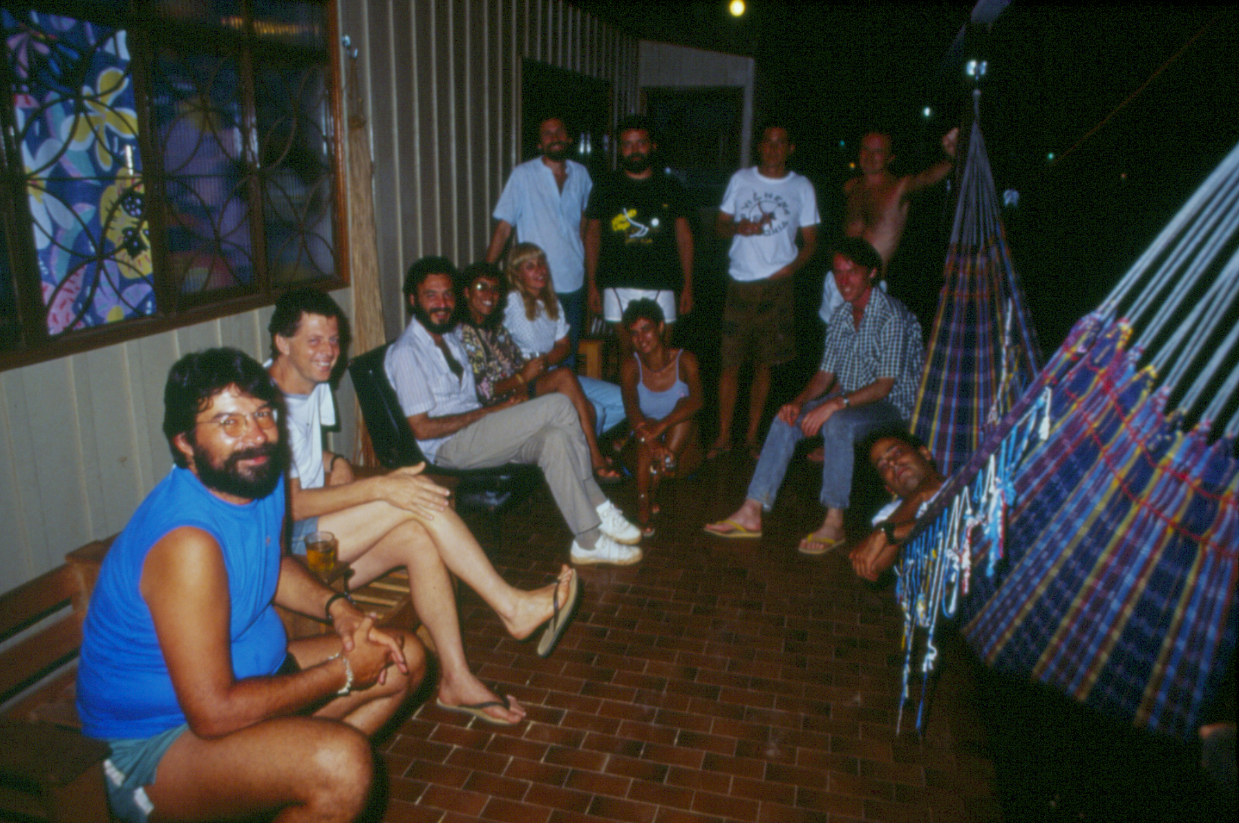 Da esq. p/ dir: Cleiton Capallossi, Beto Ricardo, Márcio Santilli, Helena Fany Pantaleoni Ricardo (quinta pessoa), Murilo Santos, Stephan (Steve) Schwartzman (décima primeira pessoa, e André Villas-Bôas (na rede), I Encontro dos Povos Indígenas no Xingu.