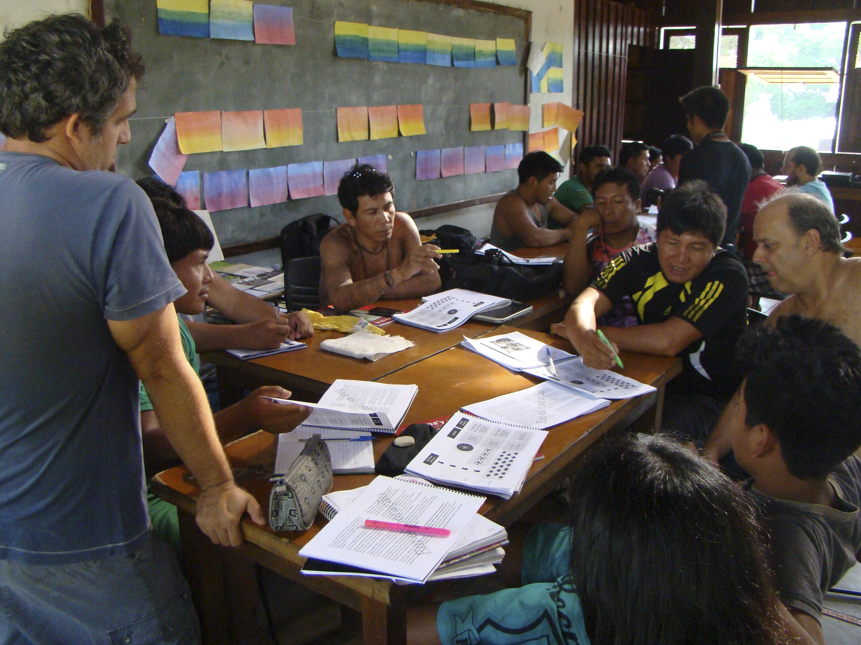 Rodrigo Junqueira, coordenador do Programa Xingu (à esquerda) e André Villas-Bôas, secretário executivo do ISA (à direita), acompanham os alunos que estão apresentando seus trabalhos de conclusão de curso, último dos seis módulos da I Formação em Gestão Territorial do Xingu, Diauarum, Parque IndÃgena do Xingu.
