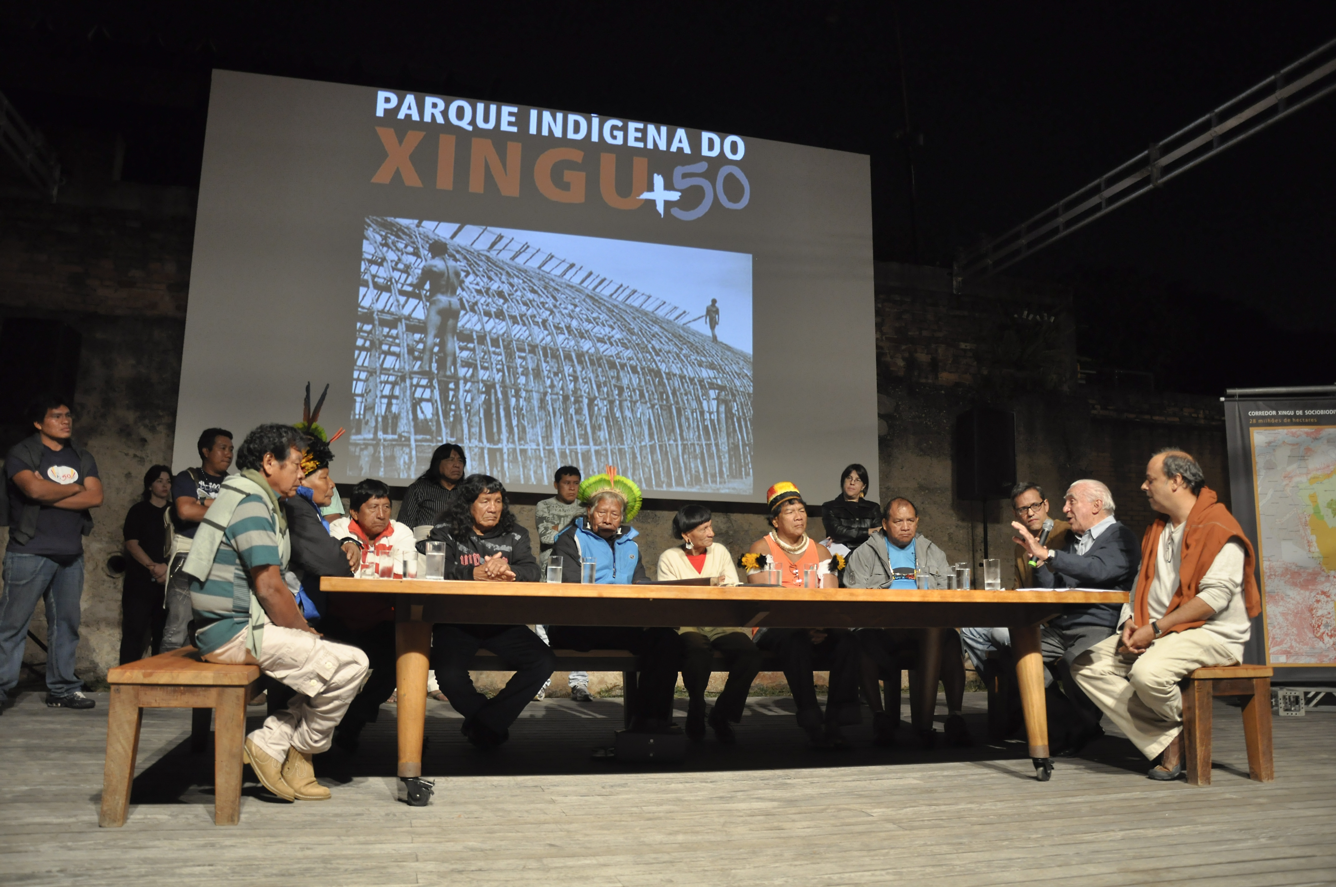 Abertura do evento Parque Indígena do Xingu+50. Mesa composta por: Mairawê Kaiabi, Aky Panará, Sadea Juruna (Tinini), Kuiussi Kisêdjê, Raoni Metuktire, Melobô Ikpeng, Pirakumã Yawalapiti, Afukaka Kuikuro, Carlos Magalhães, diretor da Cinemateca, dr. Roberto Baruzzi, médico da Escola Paulista de Medicina (Unifesp) e André Villas-Bôas, secretário executivo do Instituto Socioambiental (ISA), Cinemateca, São Paulo.