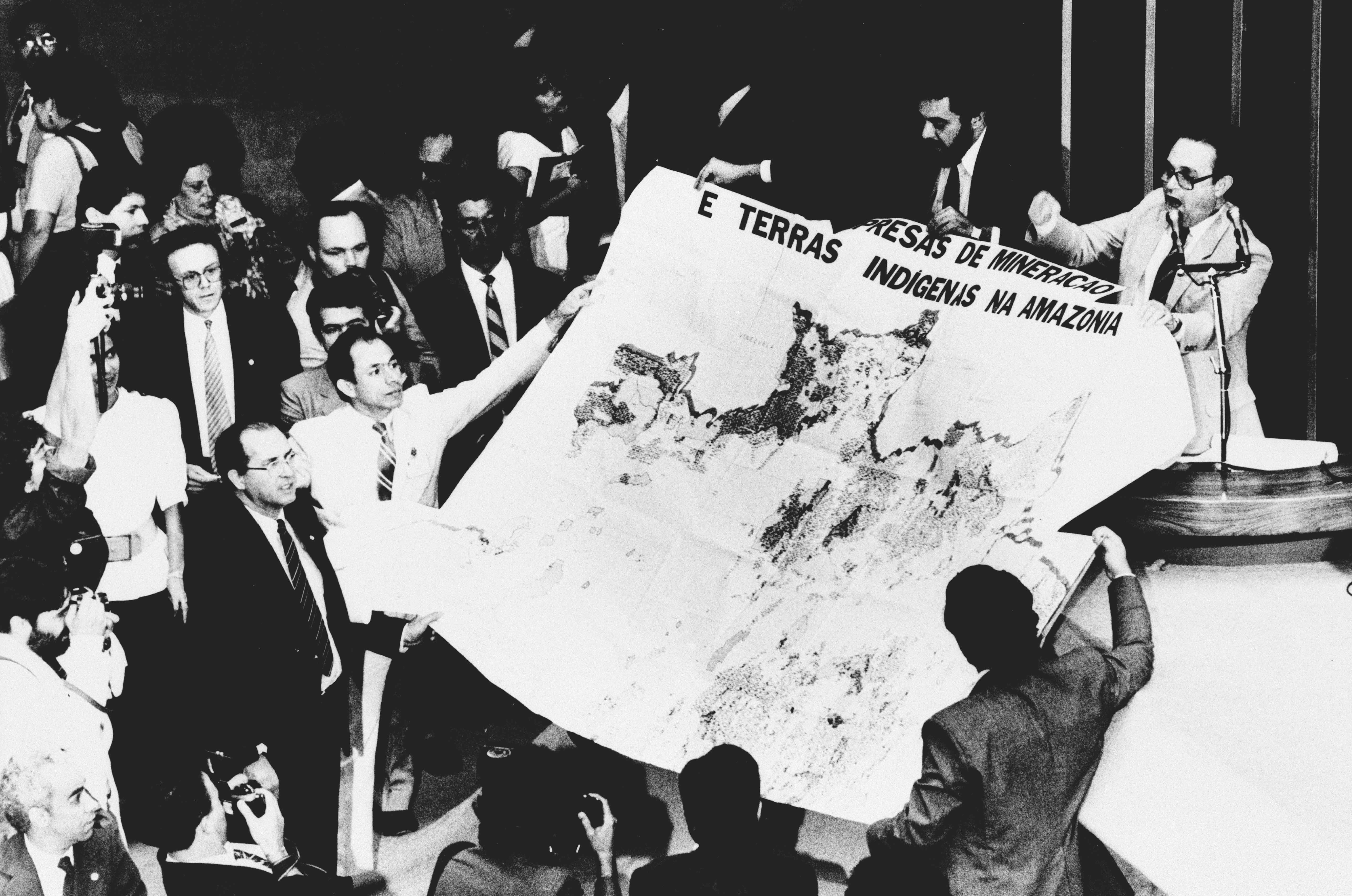 Deputado Vigildásio Senna, da Bahia, leva para a tribuna da Câmara mapa feito pelo CEDI, "Empresas de Mineração em Terras Indígenas", durante encaminhamento de votação, Constituinte, Brasília.