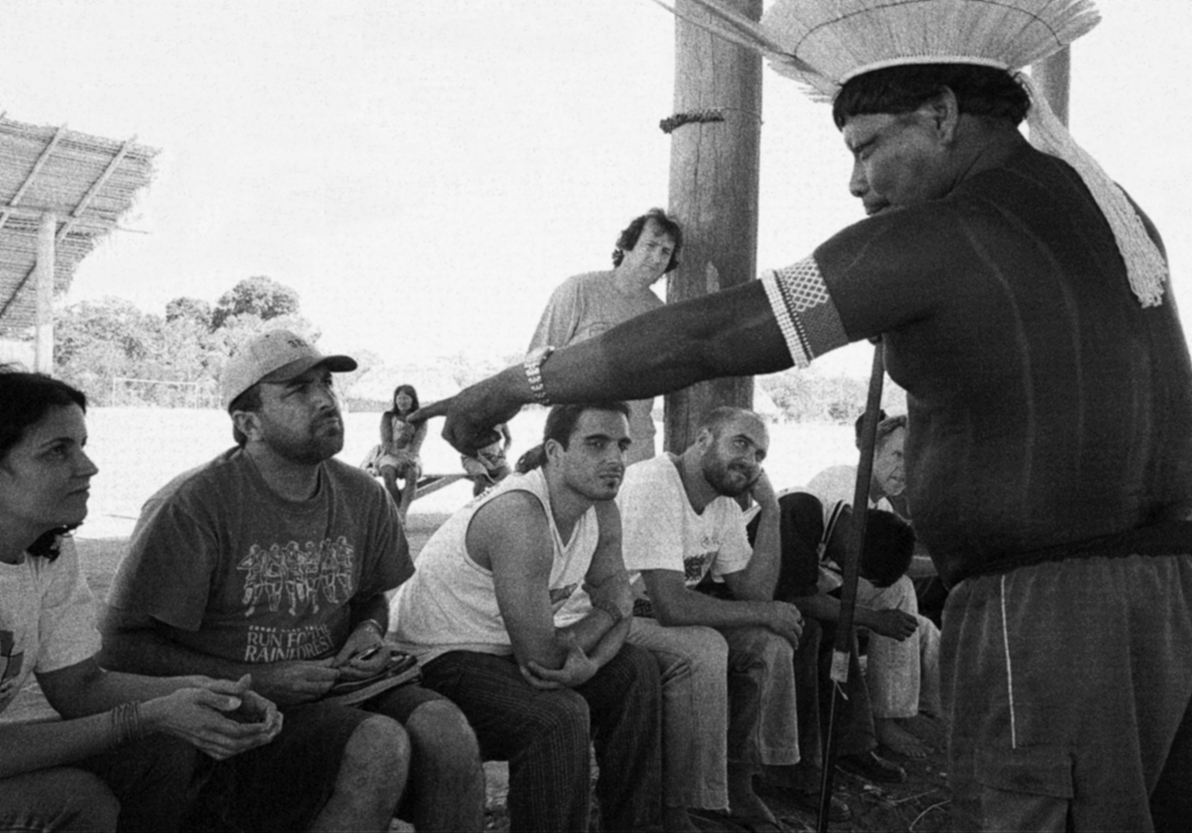 Depois de quase dez anos de luta na Justiça, os índios Panará receberam do Estado brasileiro a indenização por danos que lhes foram infligidos em 1973, durante a construção da rodovia Cuiabá-Santarém, a BR-163. Na foto, o líder Akâ Panará explica à comitiva do ISA (Ana Valéria Araújo, Sergio Leitão, André Lima, Fernando Baptista e Nilto Tatto) que os recursos, no valor de R$ 1.261.153,12, serão investidos em projetos de sustentabilidade da comunidade, aldeia Nãsêpotiti, Guarantã do Norte, Mato Grosso.