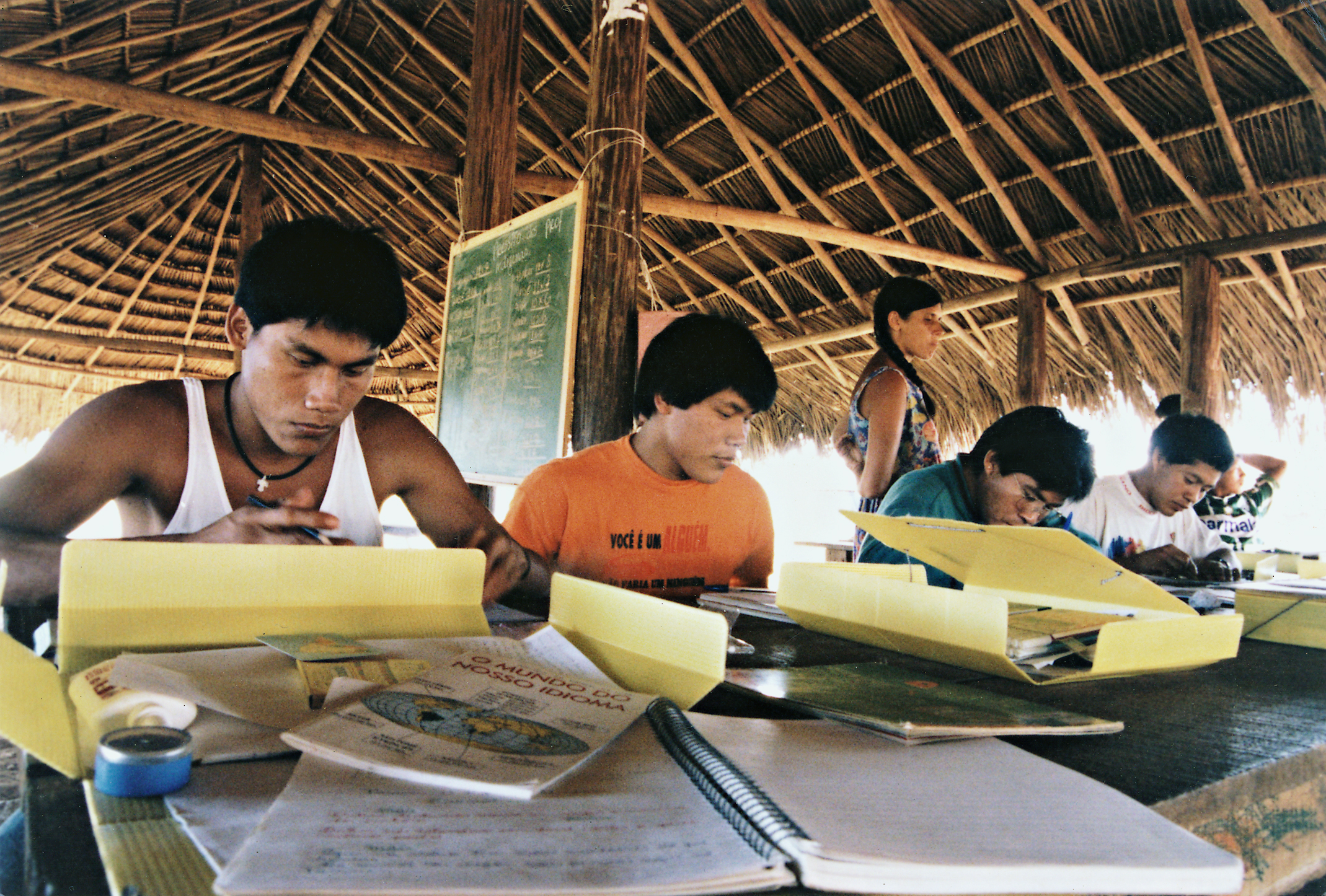 Kanawayuri Kamayurá, Ayumã Kamayurá, Paltu Kamayurá, Estela Wüker e Teki Kuikuro. Sexto Curso de Formação de Professores Indígenas do Parque Indígena do Xingu, Posto Indígena Pavuru, Mato Grosso.